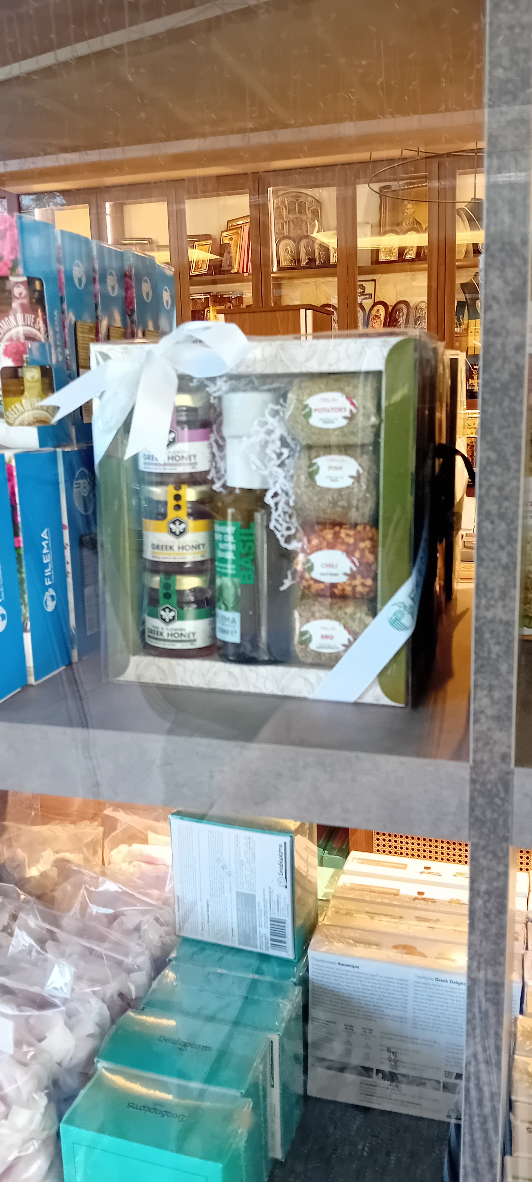 Oli esm. lahja/tuliaispaketti , jossa oli kolmea eri hunajaa ja erilaisia kreikkalaisia mausteita . Se näytti kivalta. Sen ehkä veisin tuliaiseksi hänelle, joka ei vielä Kreikkaa tunne. Ostin muistoksi pienen vihreän nahkakukkaron, johon sopii kotiavain, nitrosuihke, huulirasva,, kolikoita ja luottokortti. Siinä ne tärkeimmät!